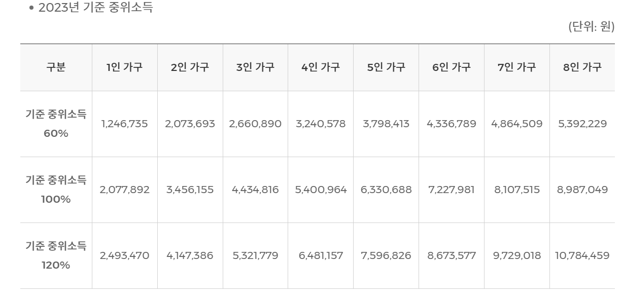 중위소득의 기준은 아래표를 참고하시기 바랍니다.