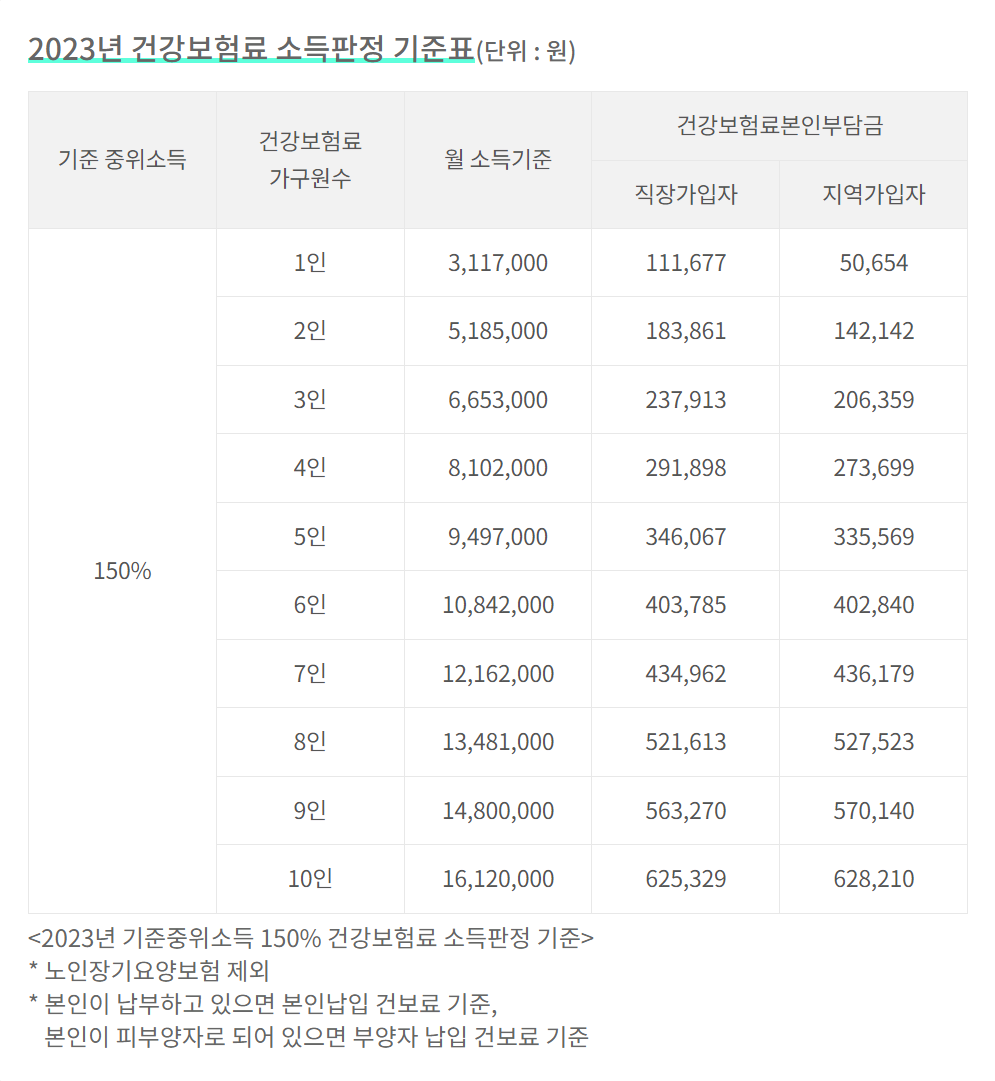 - 본인이 납부하고 있으면 본인납입 건보료 기준, 본인이 피부양자로 되어 있으면 부양자 납입 건보료 기준