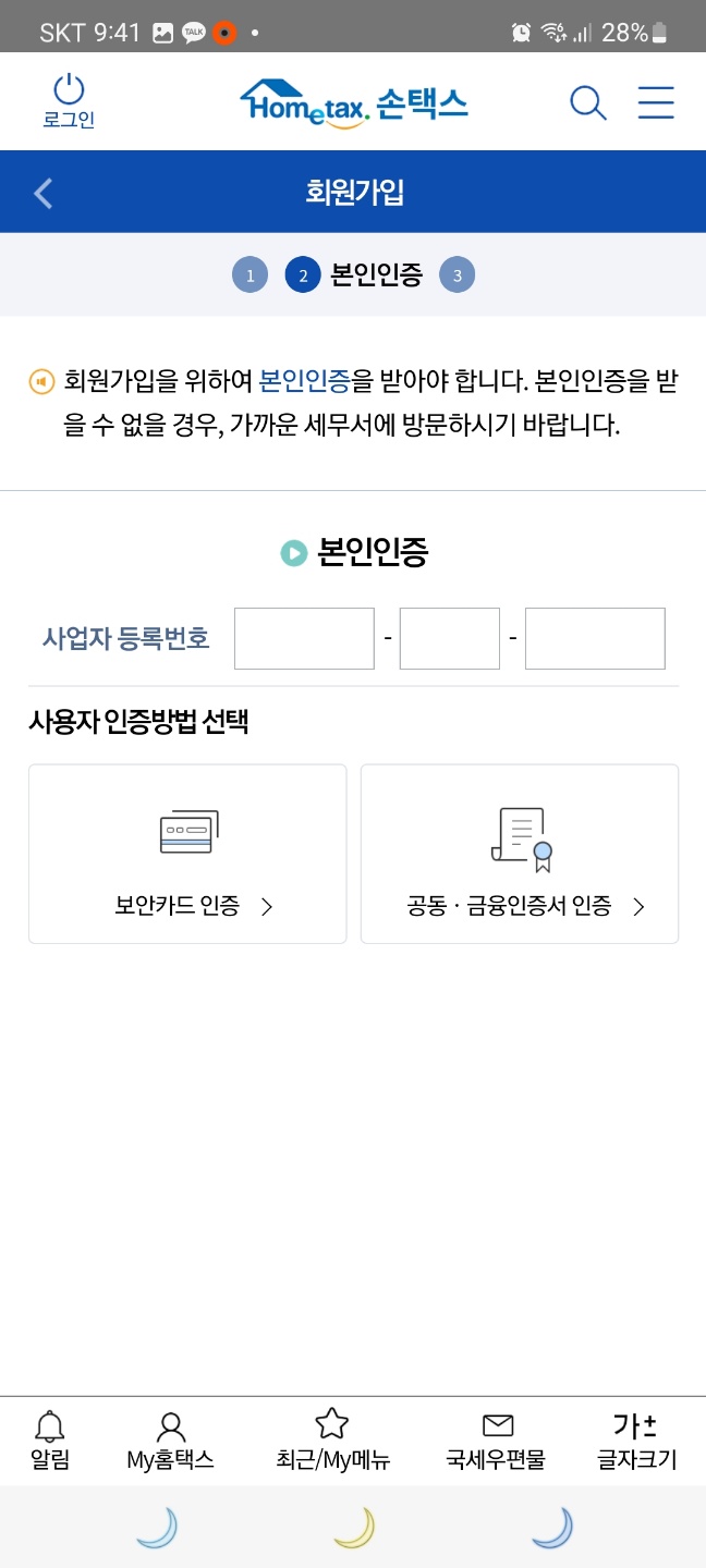사업자는 공동·금융인증서, 보안카드(가까운 세무서에서 발급 가능) 중 한가지를 선택하여 인증할 수 있습니다.