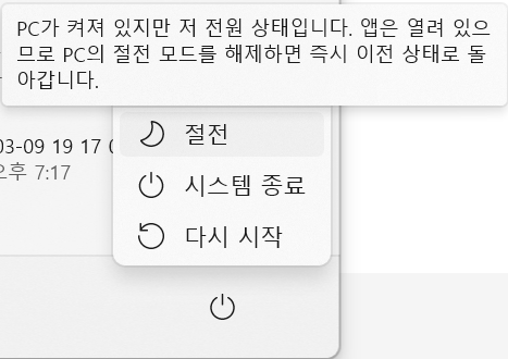 - 작업표시줄 시작메뉴의 전원버튼을 눌러 절전모드로 전환해 줍니다