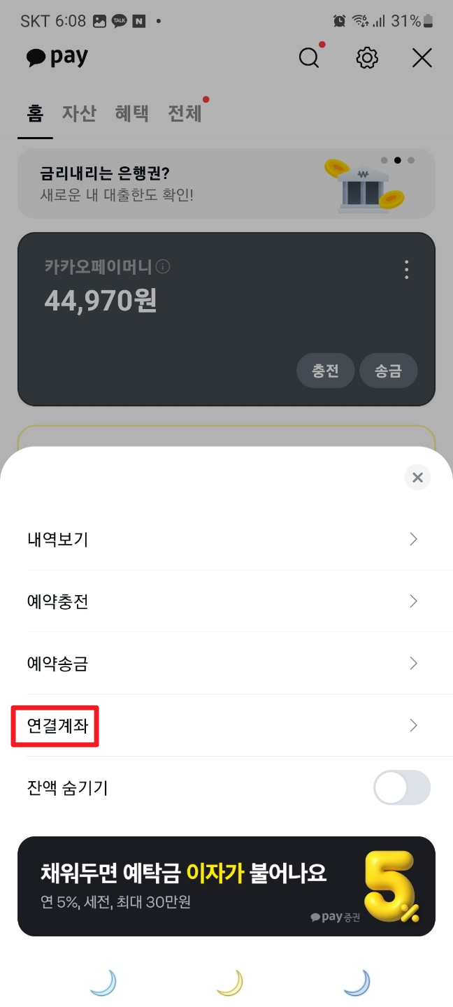 계좌송금은 내가 가지고 있는 계좌를 카카오페이에 연결하면 연결된 계좌에서 바로 송금이 됩니다