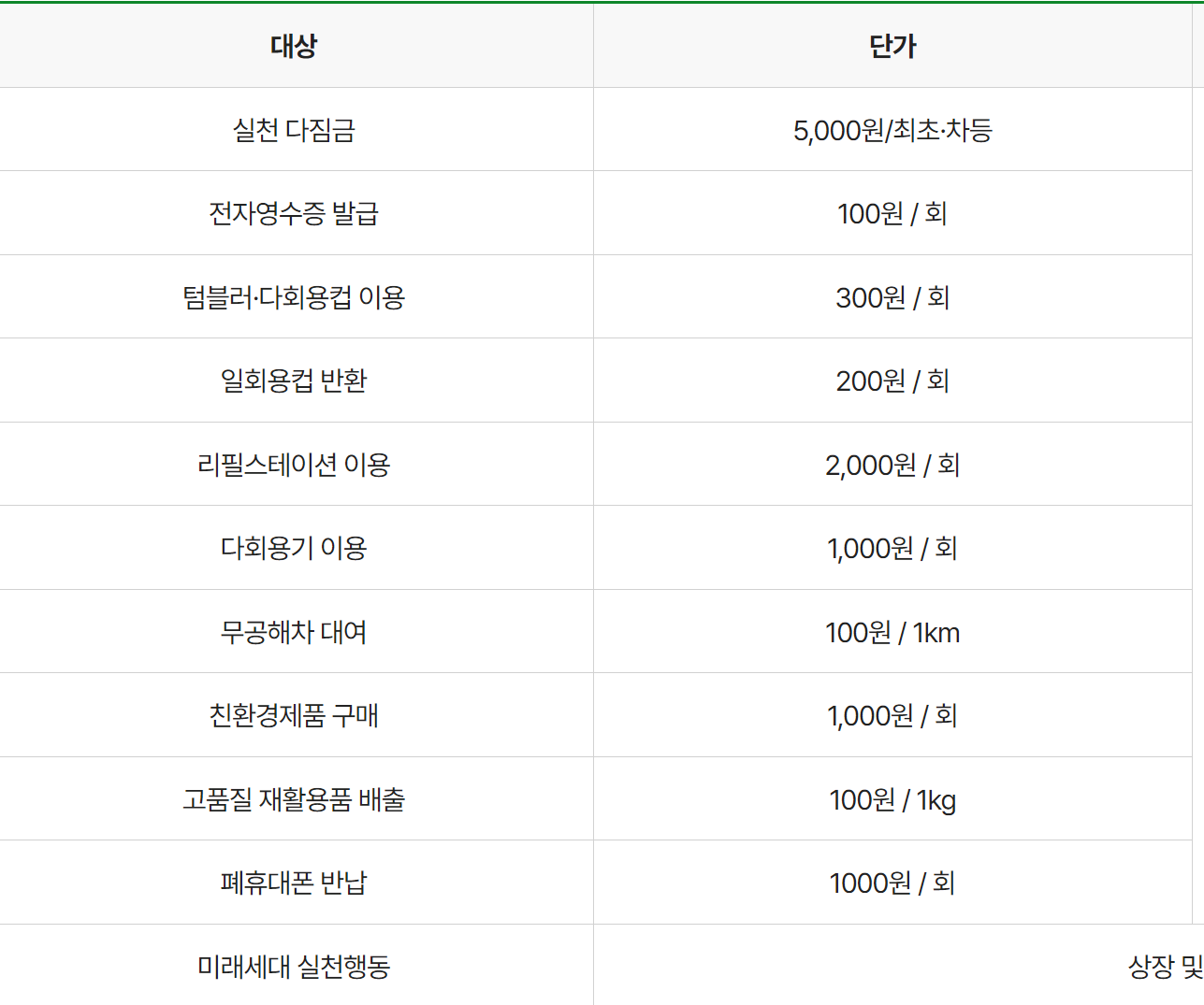녹색생활을 실천하는 방법은 다양하며 각 대상마다 적립되는 포인트가 다릅니다.