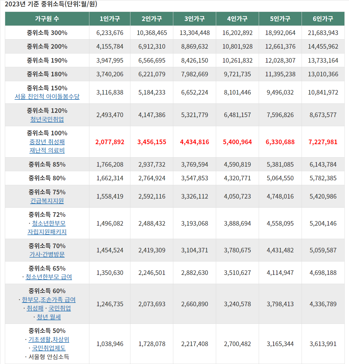 전체 가구를 소득 순위로 나열했을 때, 중간에 해당하는 가구의 소득으로 소득계층을 구분하는 기준으로 흔히 사용됩니다. 일반적으로 중위소득의 50%~150% 범주를 중산층으로 봅니다. 2015년 <국민기초생활보장법 시행령>에 따라 최저생계비의 대체개념으로 사용되었으며 각종 복지정책의 기초자료로 활용되고 있습니다.